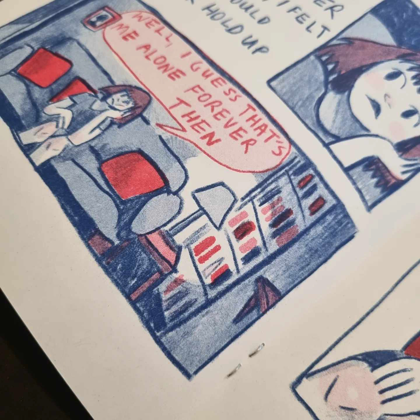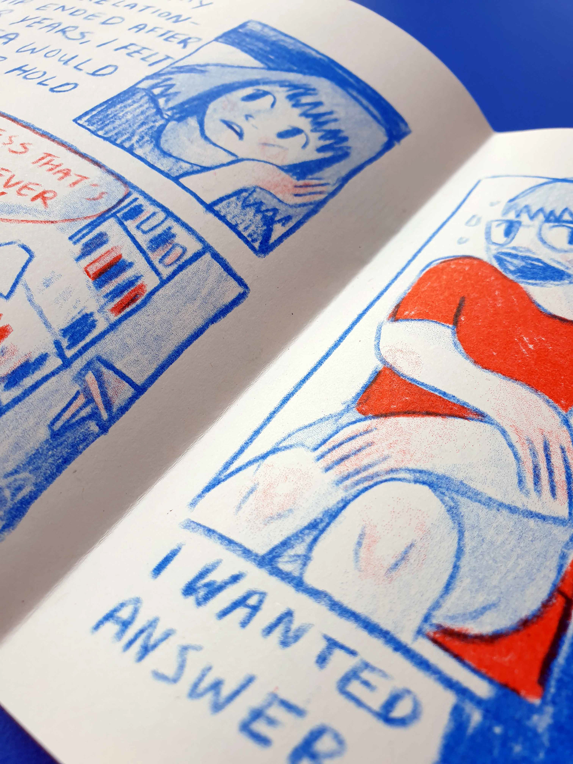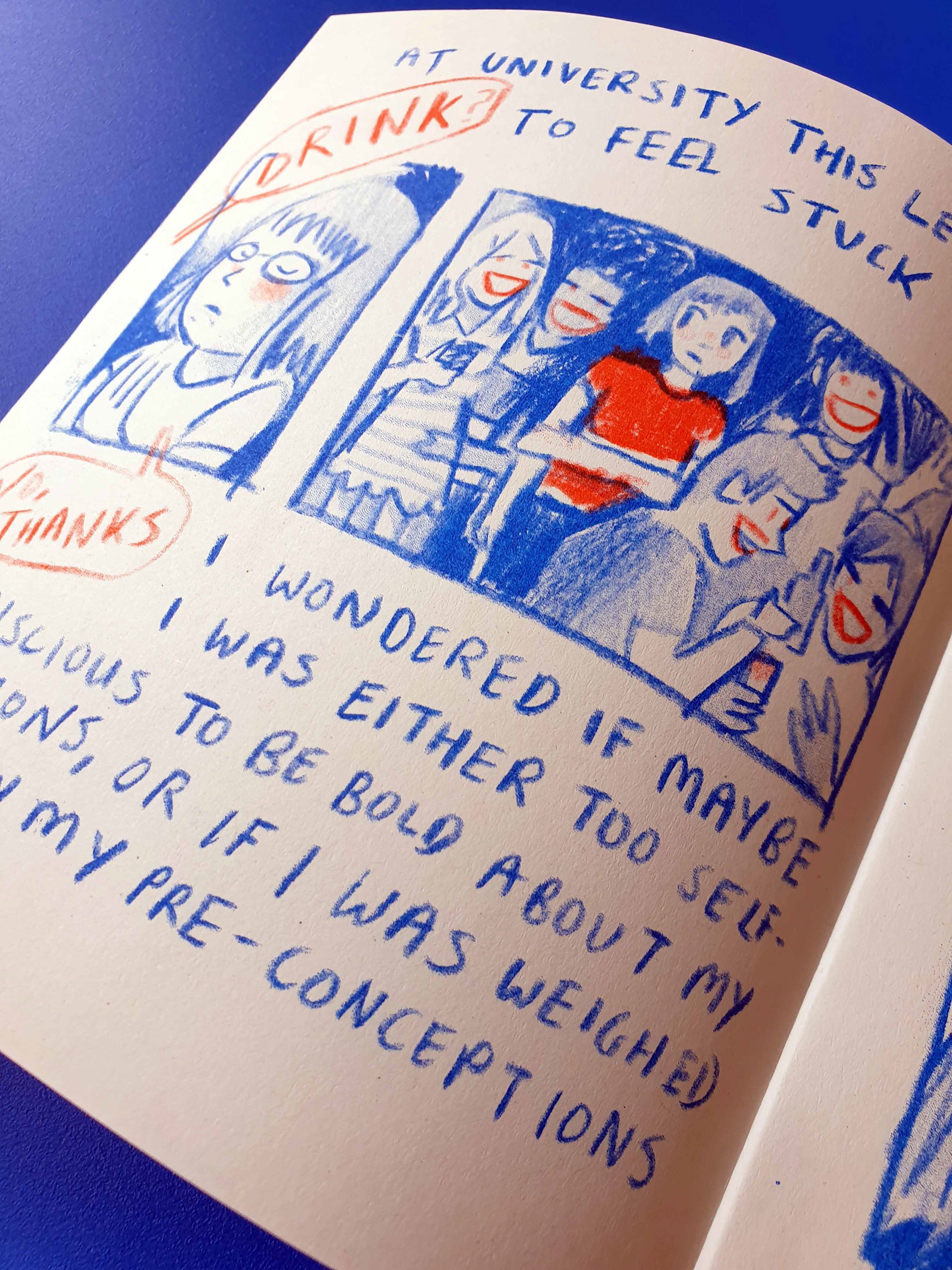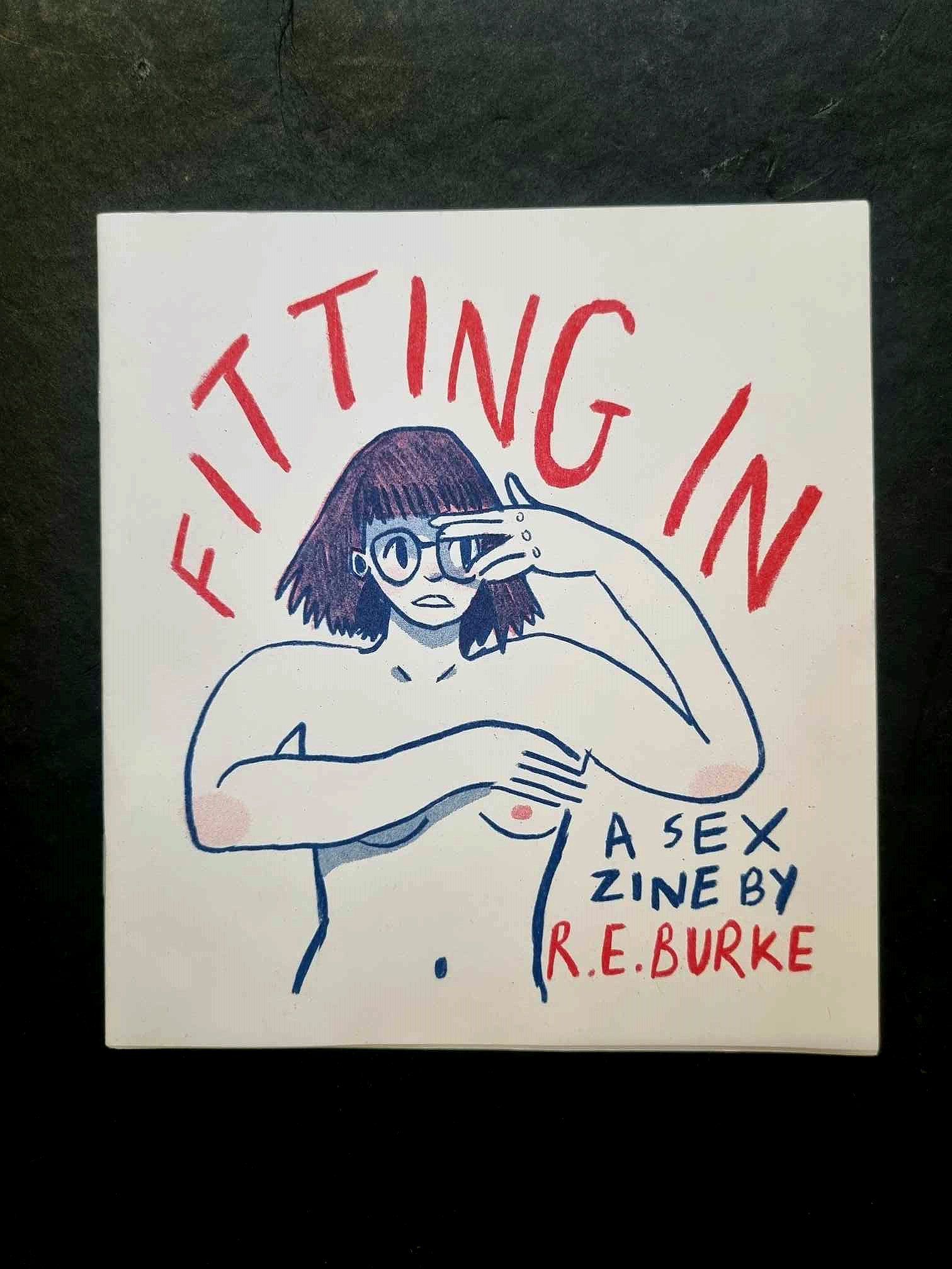 'Fitting In (A Sex Zine)' is a two-colour risograph zine of a limited edition run, about my struggles with sex and knowing what I wanted. I reprinted it in 2024, as you can see below.